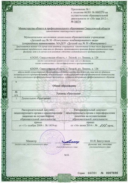 - Места осуществления образовательной деятельности по дополнительным образовательным программам: 624205, Свердловская обл., г. Лесной, ул. Ленина 126